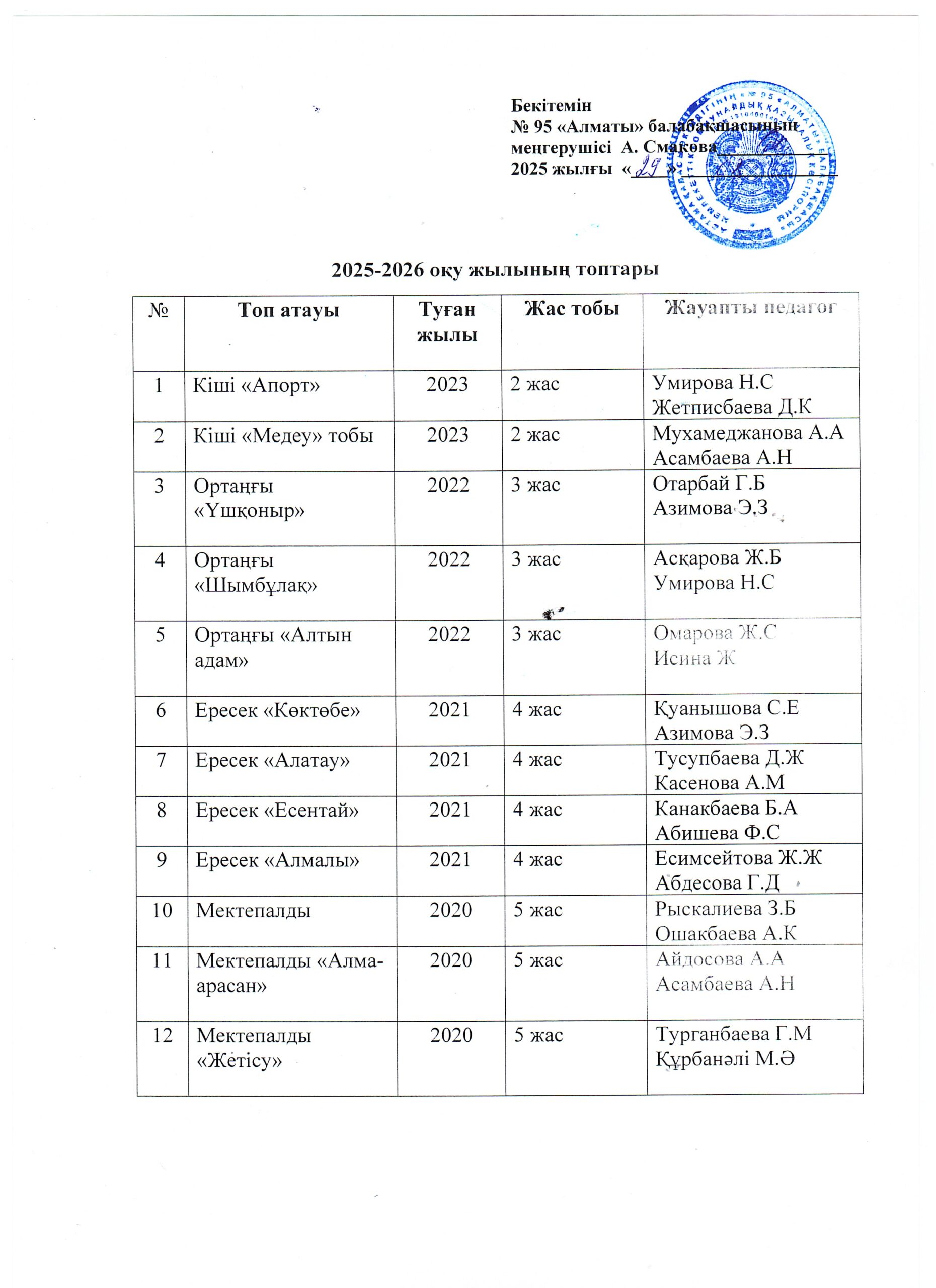 | № | Топ атауы | Жас тобы | Жылдары | Жауапты тәрбиешілер |